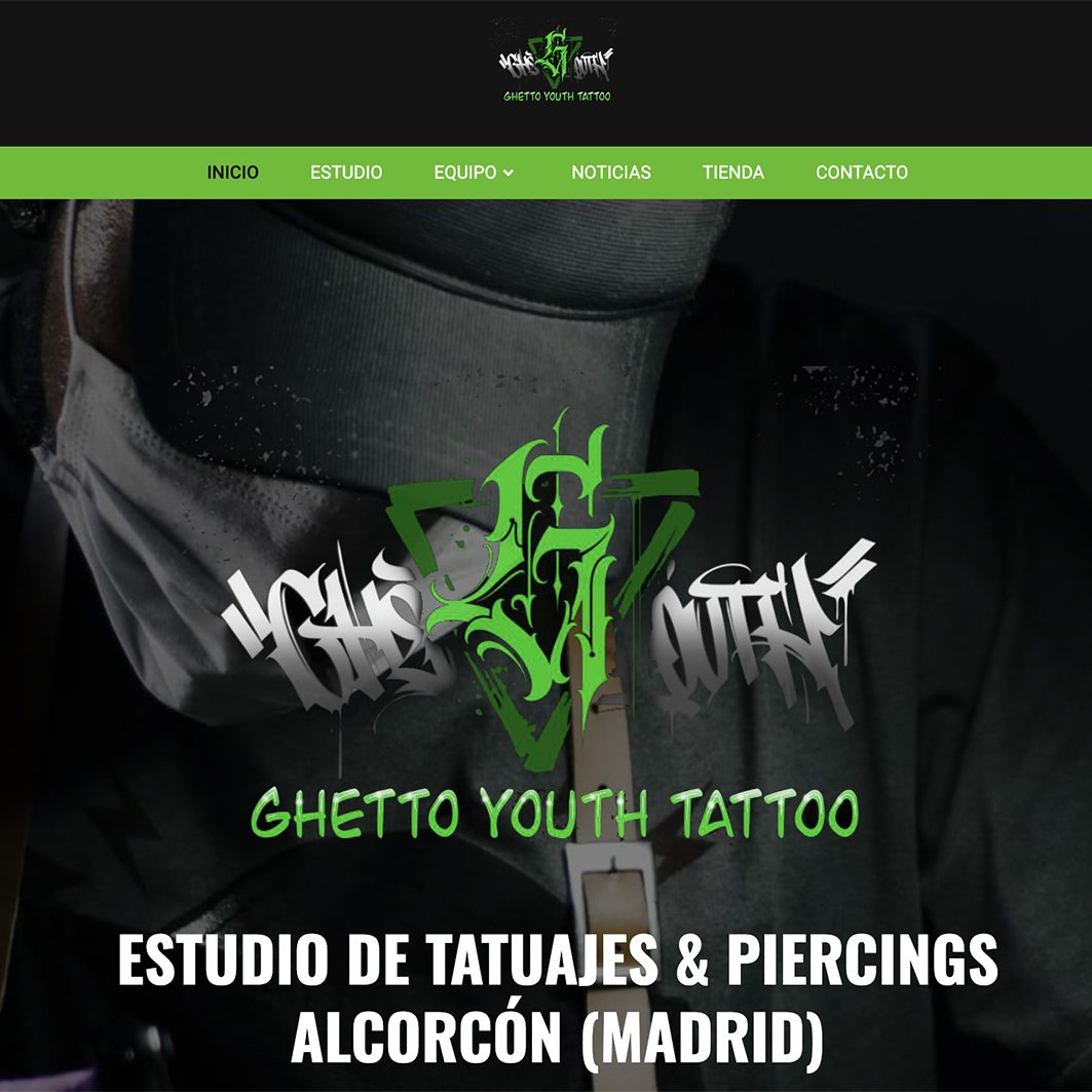 Diseño y mantenimiento a nivel técnico y de contenido de la web de Ghetto Youth Tattoo, estudio de tatuajes y piercings en Alcorcón. Web alojada en servidores de indedmedia.com